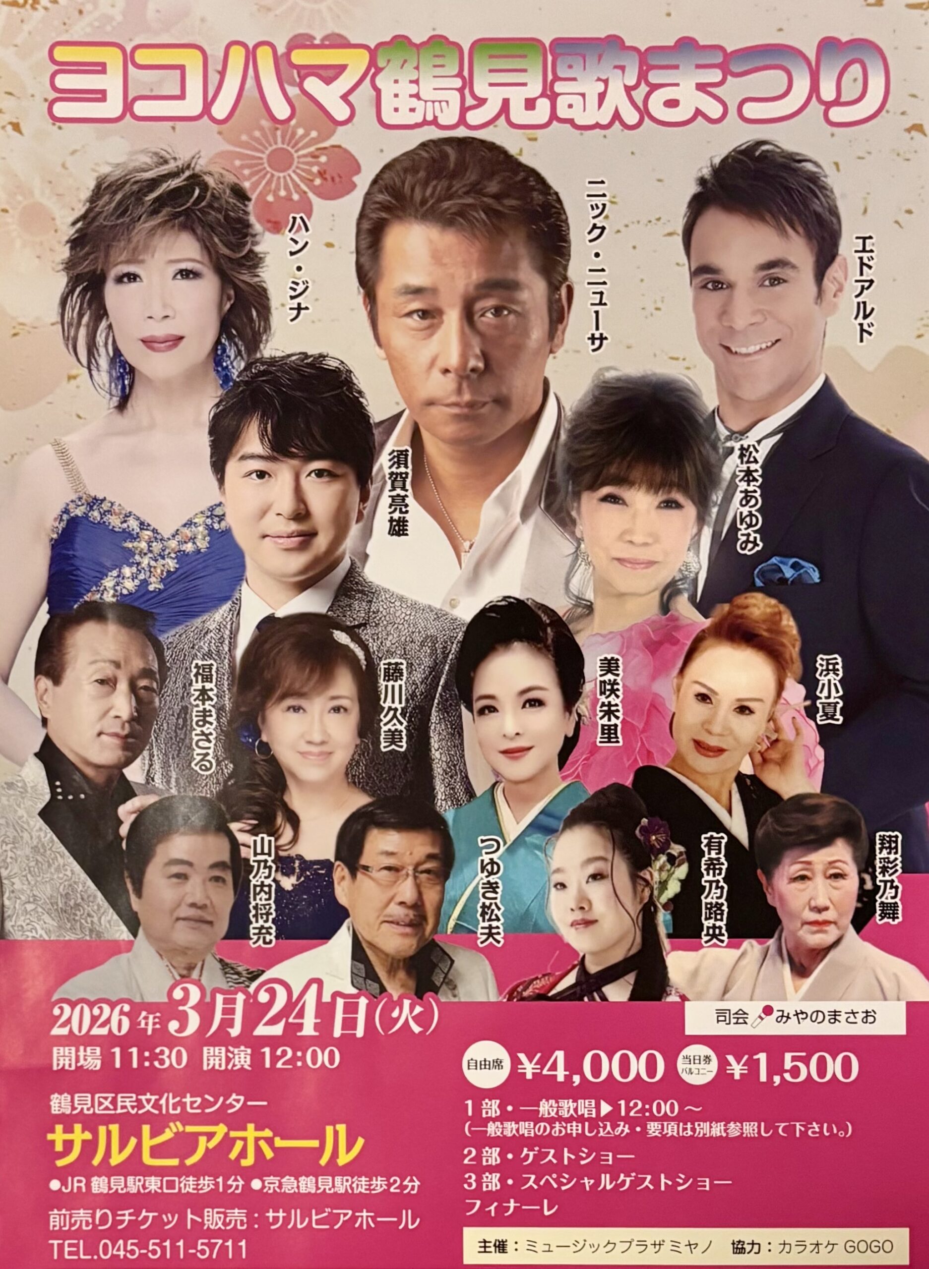 HOME > イベント > ヨコハマ鶴見歌まつり 2026年1月26日 イベント詳細 日付: 2026年3月24日 12:00 – 17:00 会場: サルビアホール カテゴリ: コンサート・有料イベント ご予約、ご連絡は090-1554-1333(路央母)まで FacebookXBluesky -